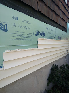 Well, four sides. Well actually, four sides of siding. The new project at DomEc is new vinyl siding for the home. The need for new siding comes from the fact that the old, probably original siding, was literally falling off the house. Those cedar shakes (shingles) were badly sun-damaged, thinning and falling apart. The particular under course used was cheap and has become host to myriad insects and attracted a good number of woodpeckers to the house. I can't blame to woodpeckers--They were not the problem. Rather the infested, degraded house covering needed to go.